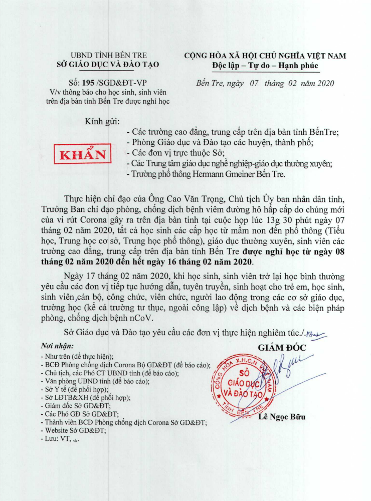 Công văn số 195/SGD&ĐT-VP ngày 07/02/2020 v/v thông báo cho học sinh, sinh viên … được nghỉ học