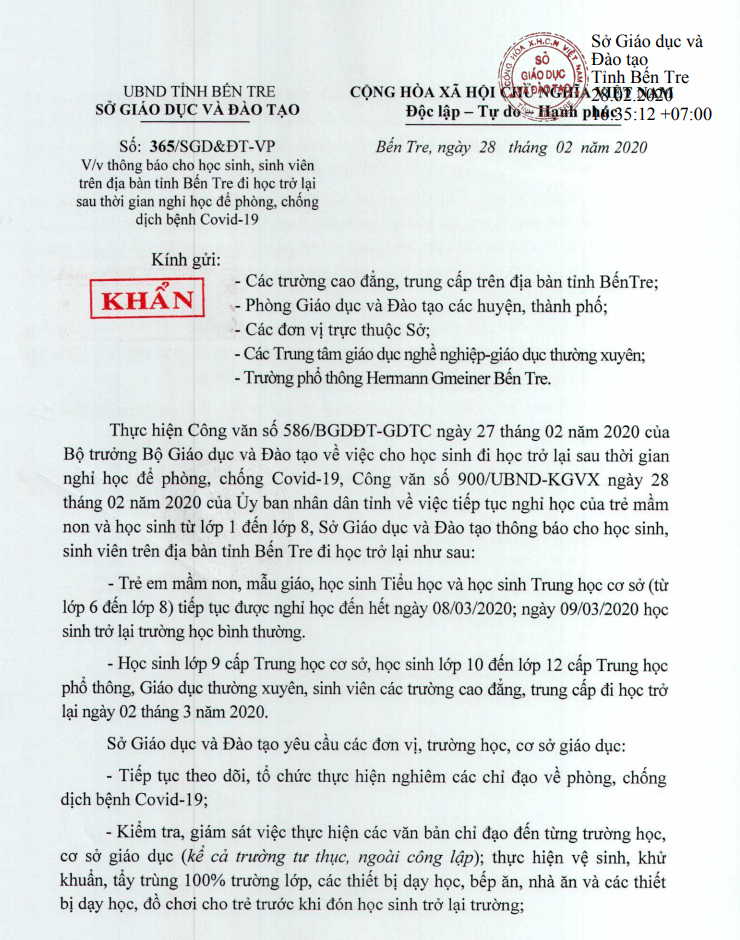 Công văn số 365/SGD&ĐT-VP ngày 28/02/2020 v/v thông báo … đi học trở lại sau thời gian nghỉ học …