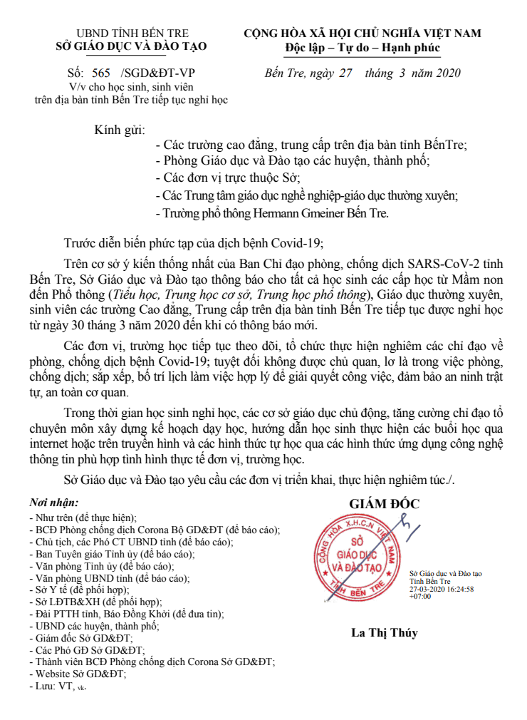 Công văn số 565_VP v/v cho học sinh, sinh viên trên địa bàn tỉnh Bến Tre tiếp tục nghỉ học