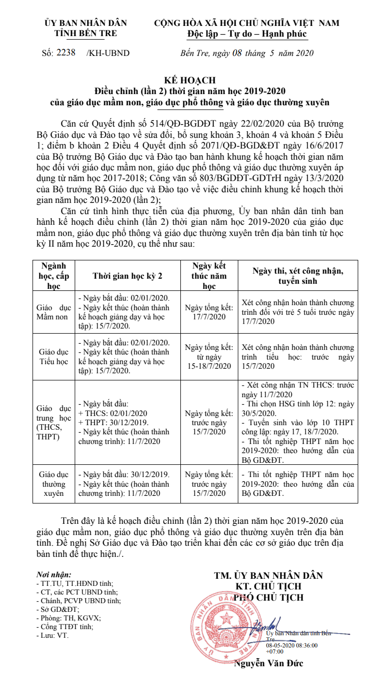 Kế hoạch điều chỉnh (lần 2) thời gian năm học 2019-2020 của giáo dục mầm non, giáo dục phổ thông và giáo dục thường xuyên